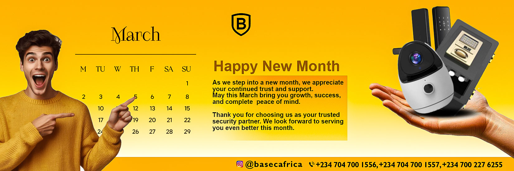 This post transitions from a warm "Happy New Month" greeting into a professional reassurance of safety. It emphasizes Base Africa’s appreciation for its customers and highlights that security (cameras, safes, and locks) is the key to achieving "growth and success" in March.