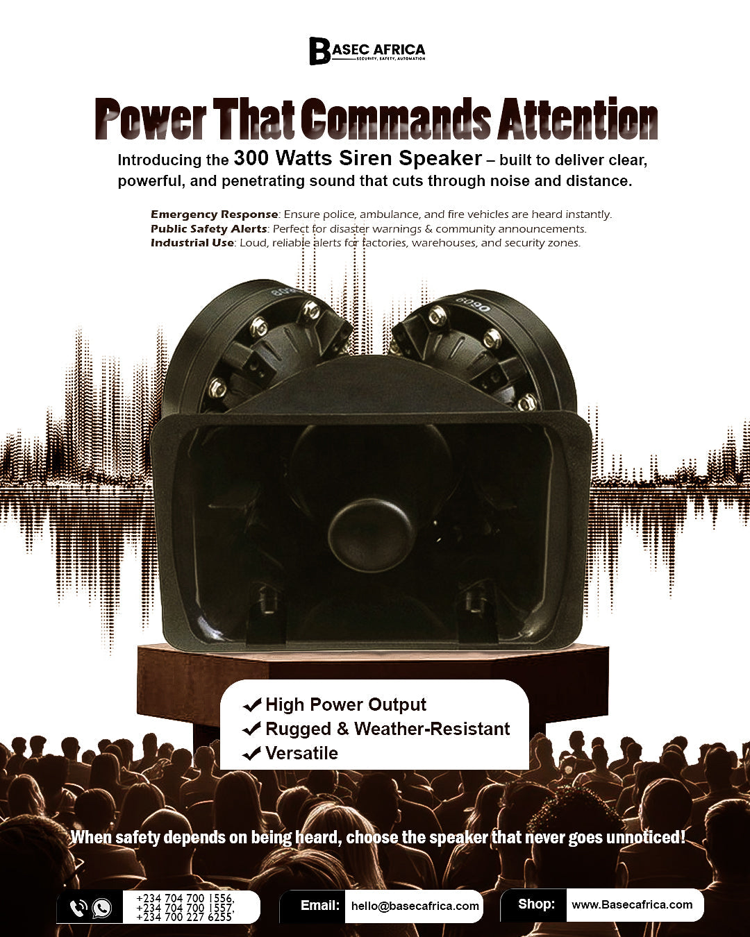 Don't compromise on safety communication. When every second counts and every message must be heard, trust the 300 Watts Siren Speaker from Basec Africa.