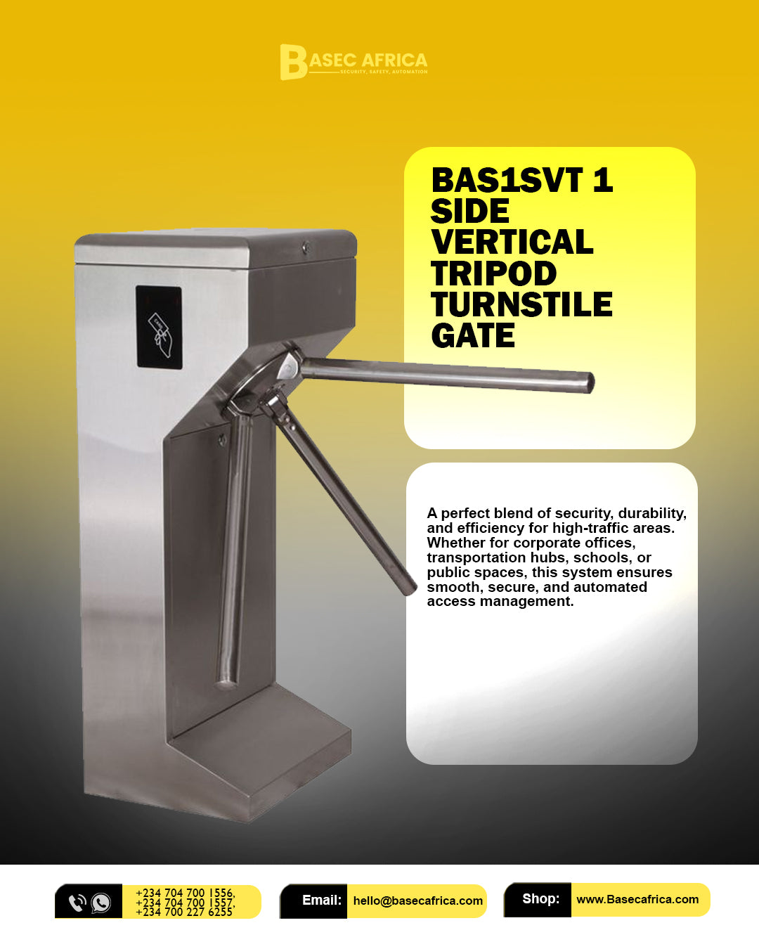 Choosing the BAS1SVT 1-Side Vertical Tripod Turnstile Gate means investing in seamless access management with a blend of modern design and tough functionality. Whether you're improving security or streamlining visitor flow, the BAS1SVT helps you take control—one passage at a time.
