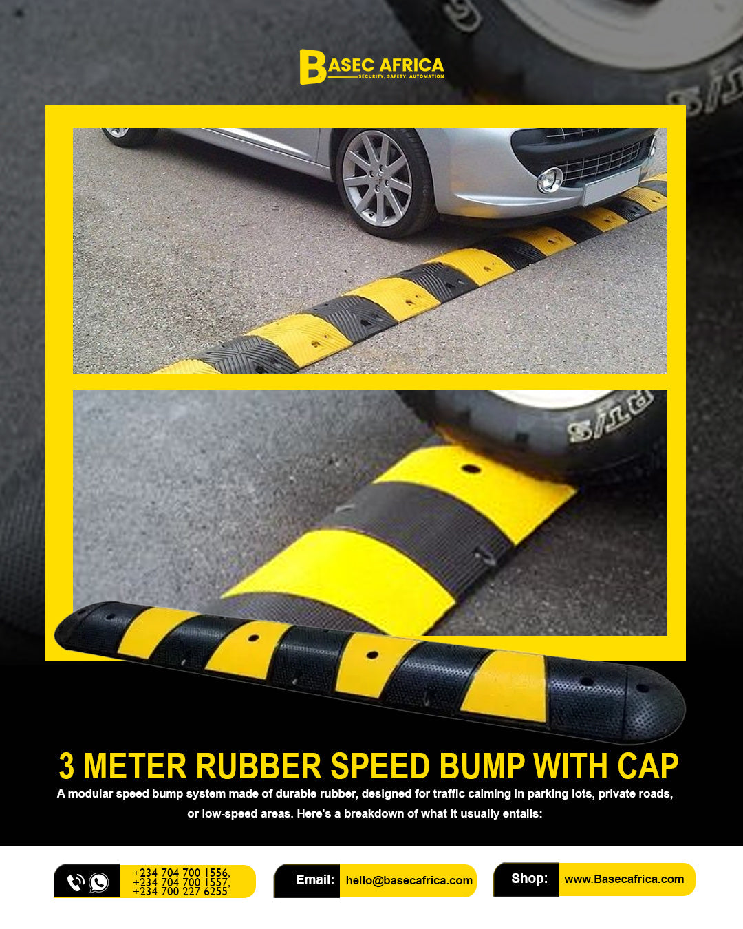 The 3-meter rubber speed bump is a modular speed reduction system made from recycled, high-impact rubber. Designed to withstand daily wear and tear from vehicles of all sizes, this speed bump comes in a 3-meter length, often made up of several interlocking middle sections and two end caps (left and right) for a clean, finished look.